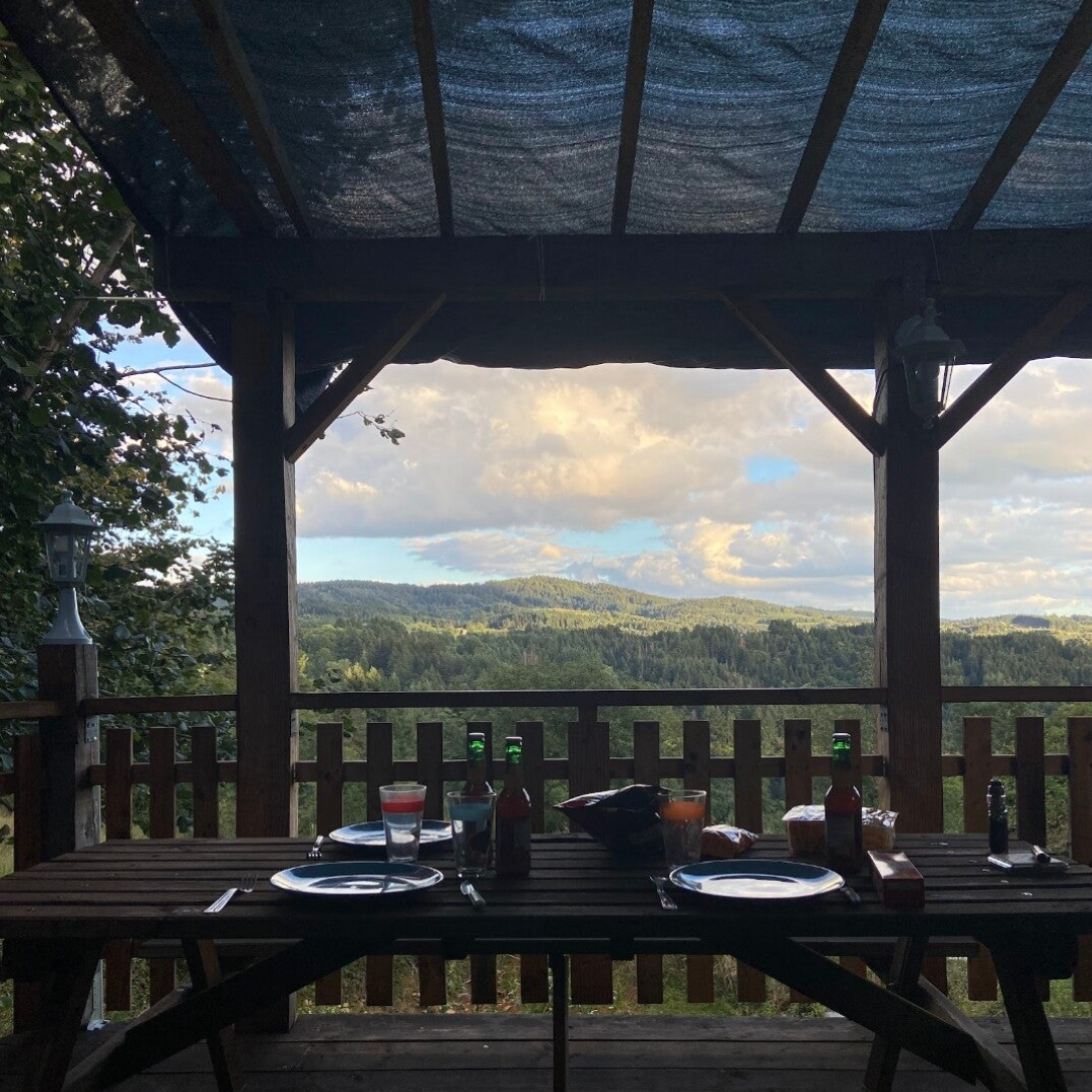 Devant la cabane, le décor est irréel. Les montagnes du Cantal s’étendent à perte de vue, calmes, immenses, presque intimidantes.